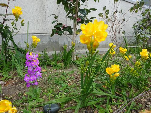 市民の方から頂いたフリージアの球根を社会福祉協議会の東側の植込みに就労準備支援の菜園プロジェクトに参加している方々が秋に植えました。 3月の下旬に入り、花が咲き始めました。 ストーンペイントの活動に併せて水やりをしながら成長を観察していました…